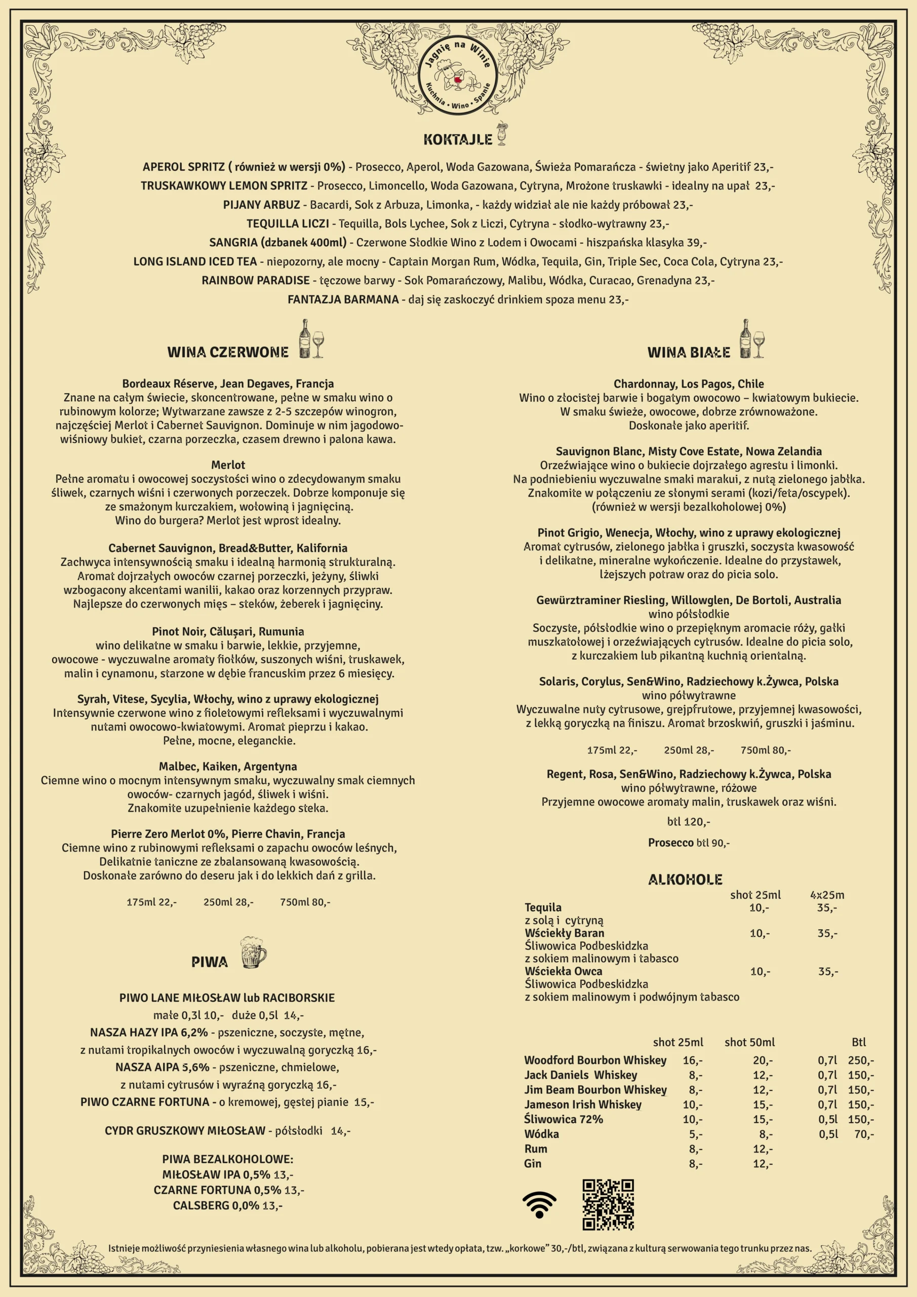 Żeby oswoić tych mniej w temacie, sparowaliśmy kilka pozycji z naszego menu z uzupełniającym smaki potraw winem. Mamy nadzieję, że trafiliśmy w Wasze gusta Jeśli nie znajdujecie w naszej karcie Waszych ulubionych win – śmiało zgłaszajcie, zawsze da się coś dla Was zrobić. Zawsze możecie przynieść też swoje wino – pobierzemy wtedy opłatę, tzw. „korkowe” związaną z kulturą serwowania tego jakże szlachetnego trunku.